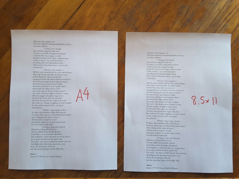 My paper size is 8.5x11. When I set the print size to DIN A4, the document prints as though to 8.5x11. When I set the print size to 8.5x11, it prints as though to DIN A4. (The red indicates the "print setting" size at which the document was printed.) So, in other words, when I print to A4, the document prints correctly (on 8.5x11 paper).