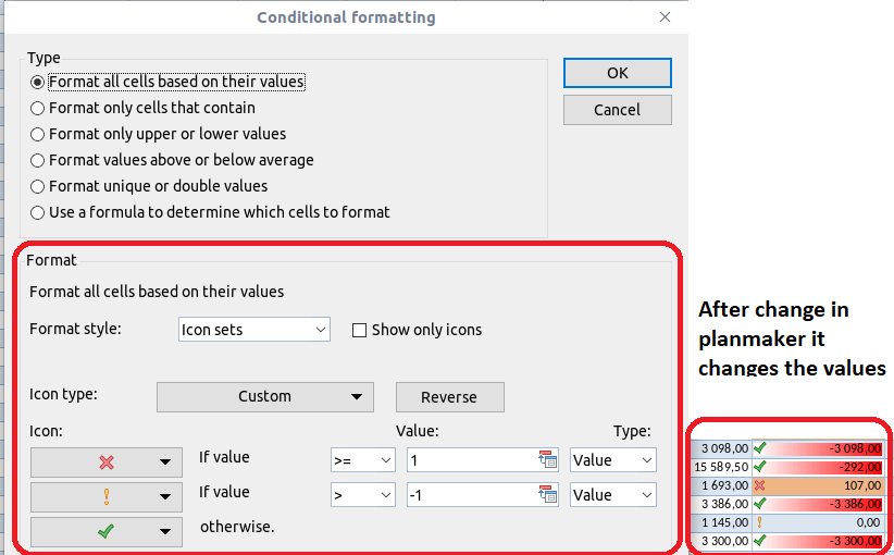 The conditional formatting changes and shows wrong icons in the cells. The green check should be where value is zero but it is now where value is negative, the exclamation mark should be where value is greater but it's at where value is zero and cross should be where value is negative but now it shows where value is greater.