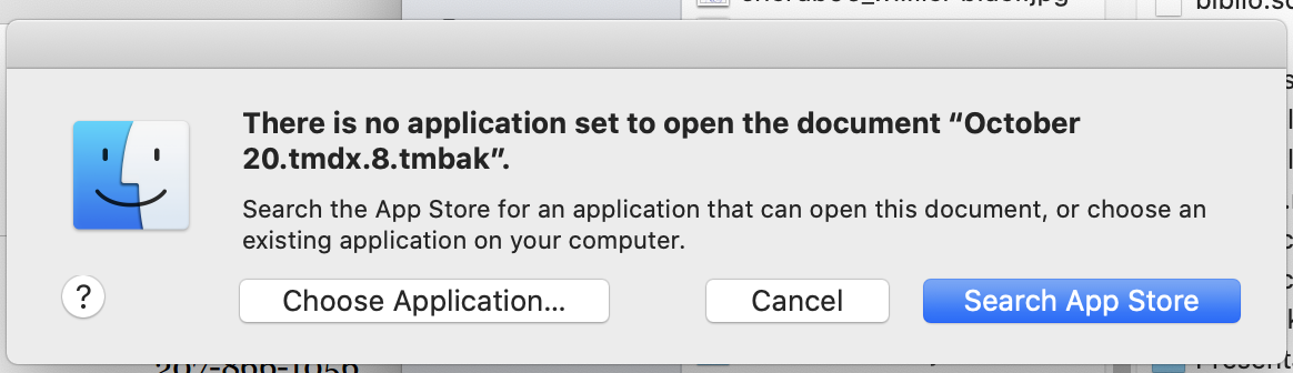 The problem is that when I try to open those backed up documents, there is displayed a notice "There is no application set to open the document ..." The extension on the backup is .tmbak. Please see the attached pix.