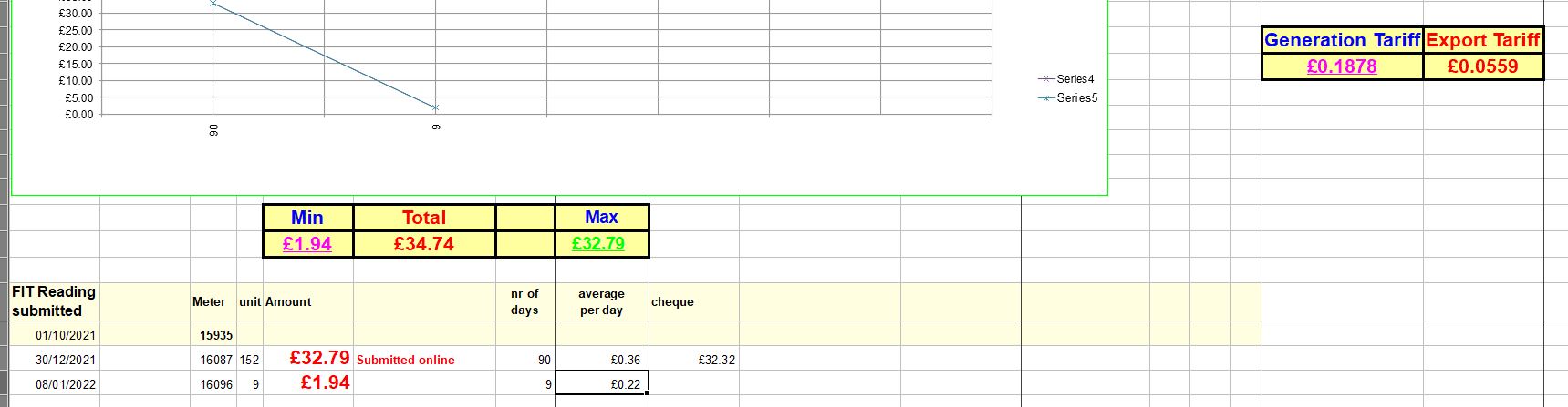 I have solar panels and get a feed-in tariff from the gas company. I just want to be able to estimate to a closer level how much will be paid to me after the readings are taken. Reading are done weekly but payment every 90 days.