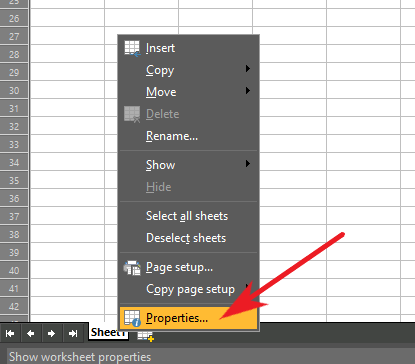 Or you can access this by right click on sheet's name and then select properties.
