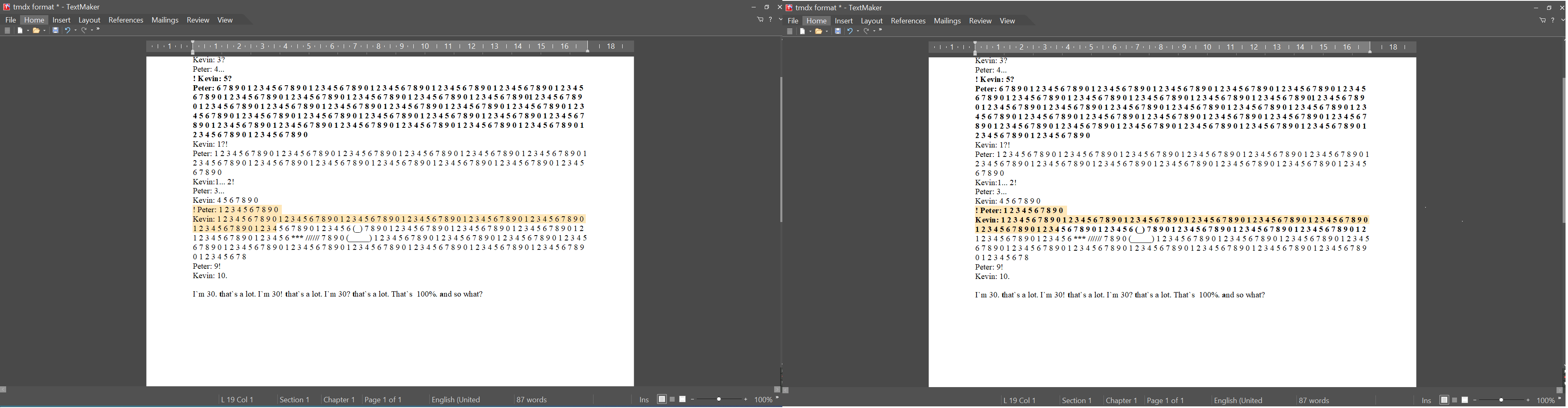 For instance, I have some conversation like on the screenshot 2. (I used numbers on purpose, that`s not a real dialogue and I`m not that mad so far, but it works with words the same way.) Then I want to make bold the following selected lines (screenshot 2, left side). And on screenshot 2 on its right side you can see what I get after pressing Ctrl+B (variant 1). I think that should not be like that, should it? And there is another pattern with bolding another part of the conversation, see screenshot 3 (variant 2).