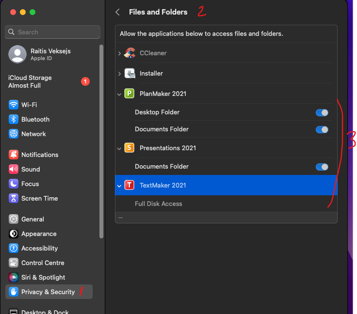 PlanMaker NX, Presentations NX and TextMaker NX all have Documents Folder access in Privacy & Security/Files and Folders.