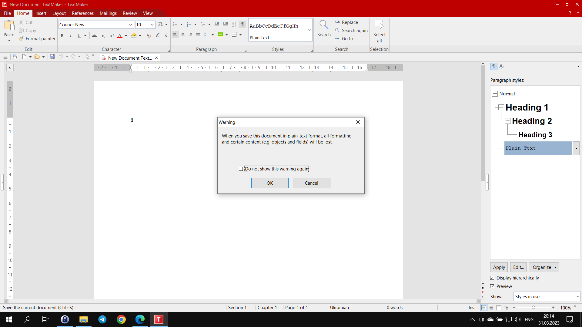 1. I create TextMaker document with Explorer in any folder (with right button menu) -> I get an empty file that has 0 bites ("New Document TextMaker.tmdx") -> I open it and see that it has plain text paragraph style from the beginning -> I press a "Save" button and I see the warning window -> I need to use a "Save as" button and save document as pmdx to save it styles.