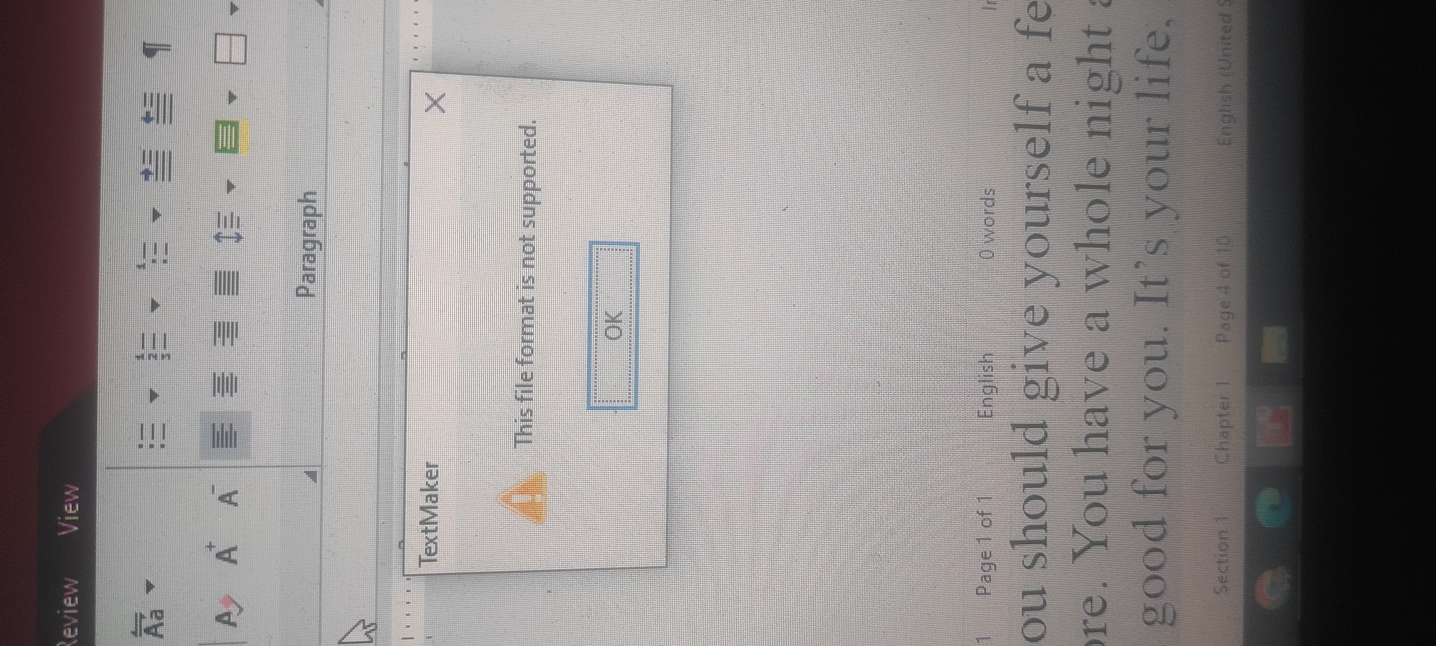 I was writing a novel since last 6 months in textmaker but suddenly today when I opened the file then I got a error, "this file formate is not supporting". Please recover my file, it's not just a file rather my hardwork of months.