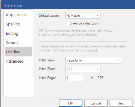 Perrorist wrote: Mon Jun 17, 2024 10:55 pm Thanks for your reply. The Default Zoom is Fit in Window. There are no other options. Selecting Override initial zoom seems to have no effect. The other options apply to individual documents. Even then, the only options are Page Only for Initial View and Default for the Initial Zoom.