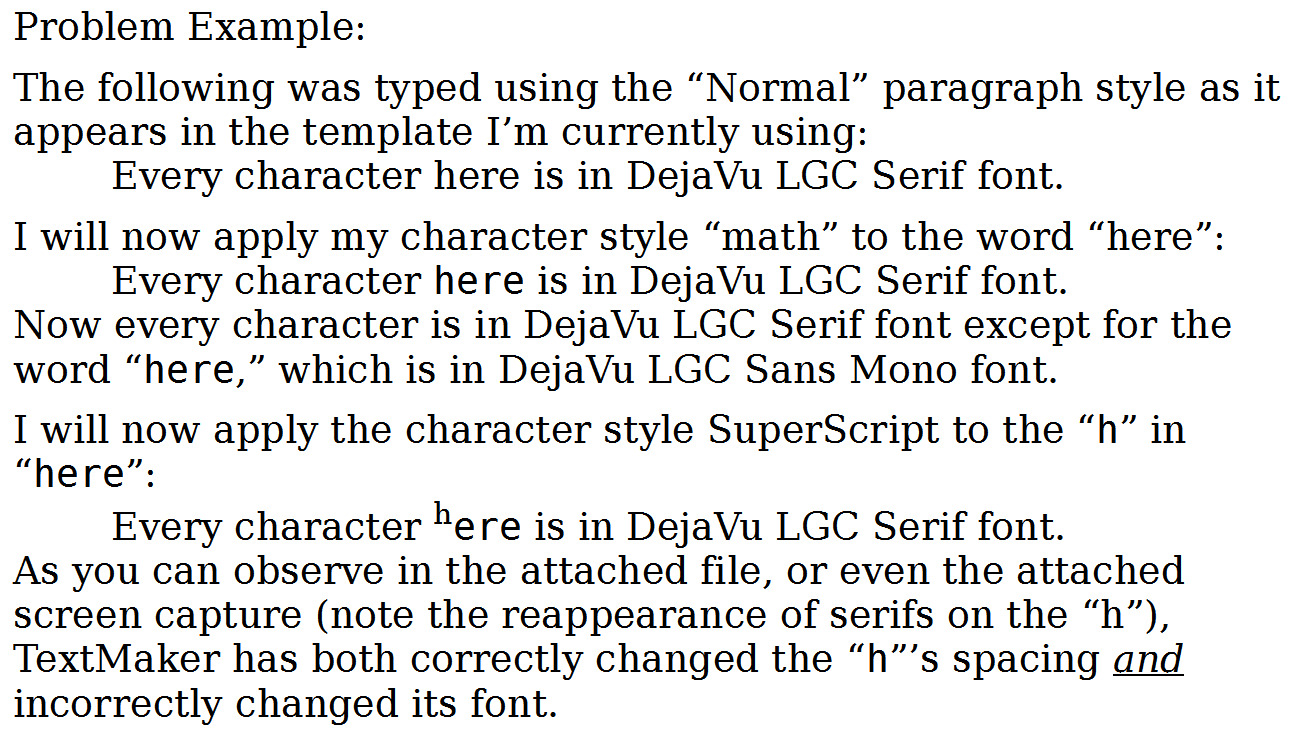 I created a character style “SubScript” and “SuperScript” so that I could subscript and superscript characters as I preferred, rather than as TextMaker prefers. Both character styles only contain changes relevant to subscripting/superscripting and are “based upon” “(floating).” Despite the use of “(floating)” and the assurances from the online (i.e. where it shouldn’t be) help, these character styles change the font too, if the font is not the default font of the paragraph.