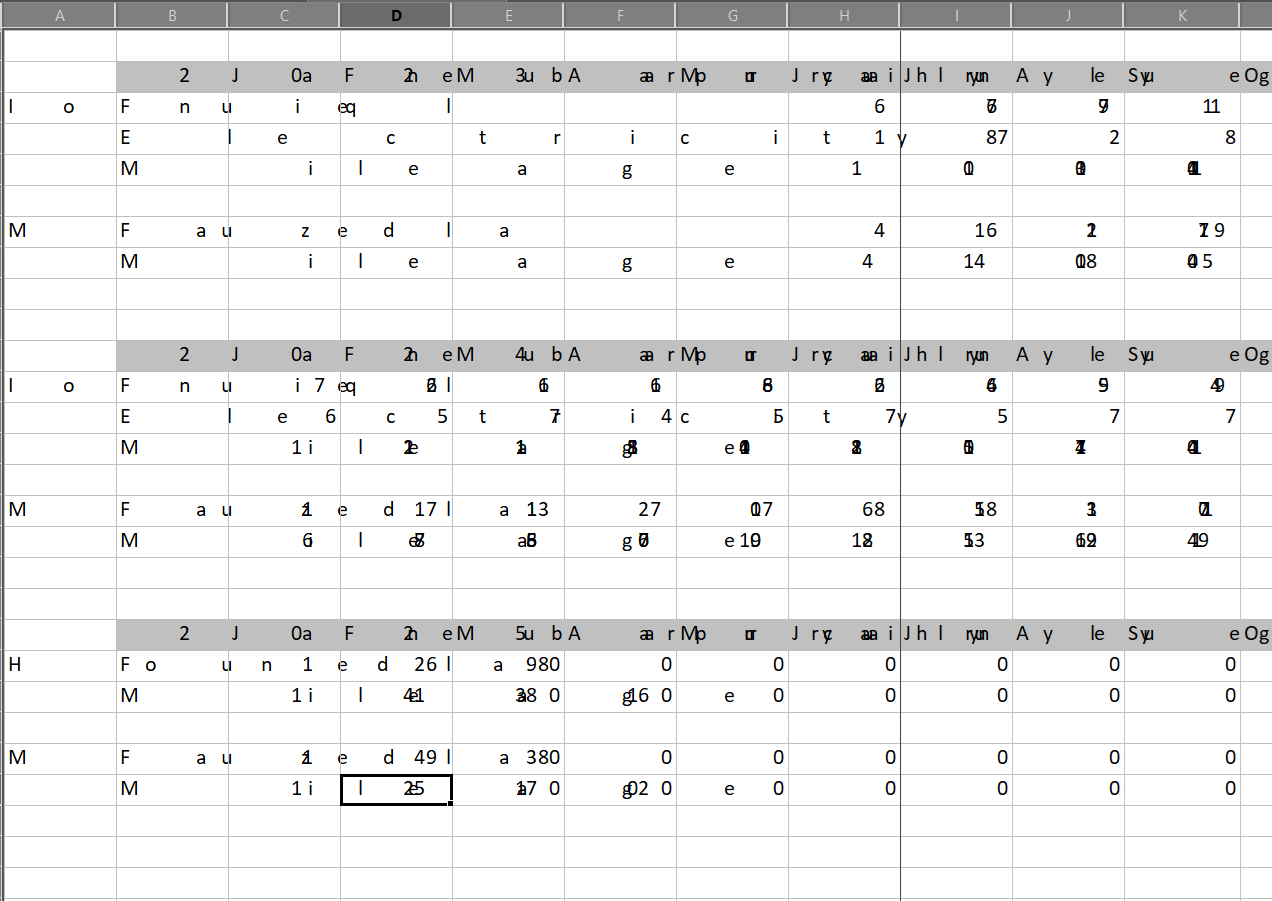 The data appears to be distorted with characters overlapping and misaligned. However, clicking on any cell reveals its content in the input field without any errors, so it seems like a rendering issue only. Besides, closing and re-opening a file makes it go away, at least until next sleep cycle.