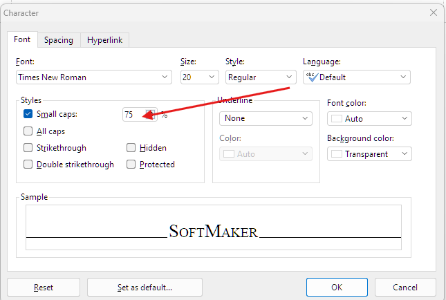 What percentage of the font height does TextMaker use for the artificial small caps? Whatever percentage it's set for, it's too small. Can this be changed in a future update> (If so, please issue the same fix for TextMaker 2021.)