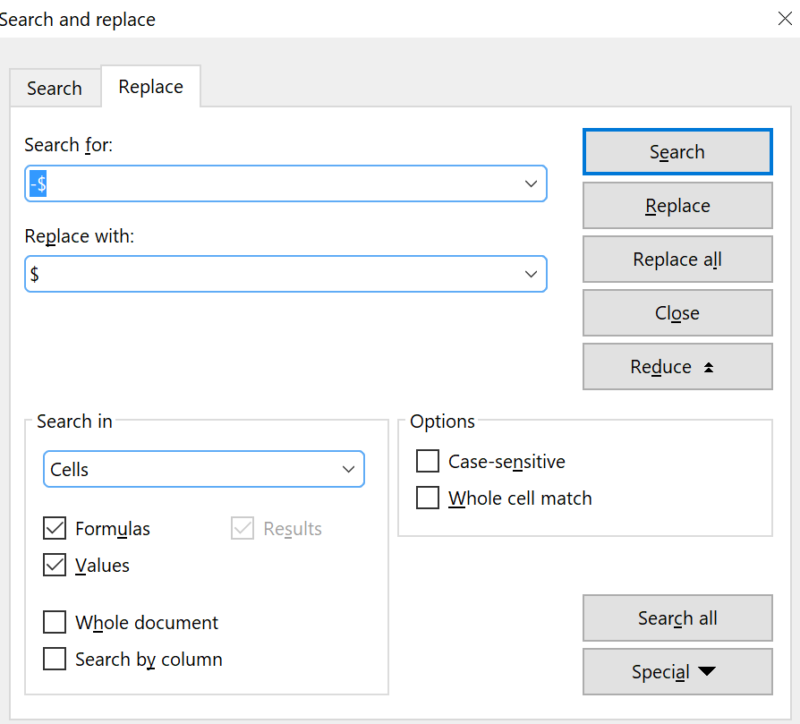 I found the fix that worked for me. I too imported from my card charge company. the fees were all negative and would not sum. The only way I found to convert them all to positive at the same time was using the search and replace command.