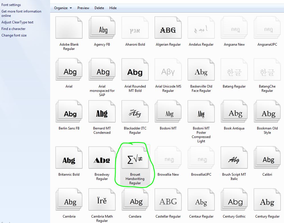 I see the Brouet font, but not Agilo, Nadine, Pietro, or any of the others. How come? I have attached a screen capture of the fonts window.