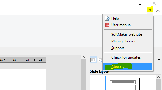 I'm new to this forum, using Soft-Maker Office (professionell?) 2018 on a windows 8.1 machine. I don't know the current built-version, there is no "Help\About" anymore (or I can't find it).