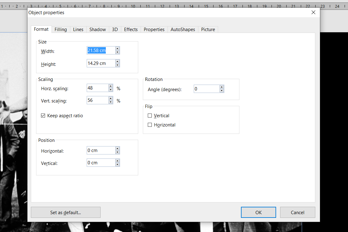 If I double click on the image to bring up the properties, I can see that Presentations has scaled the image - but not proportionally - horizontal scaling is 40% and vertical scaling is 45% - even though the image started off in the right ratio and the 'keep aspect ratio' box is ticked