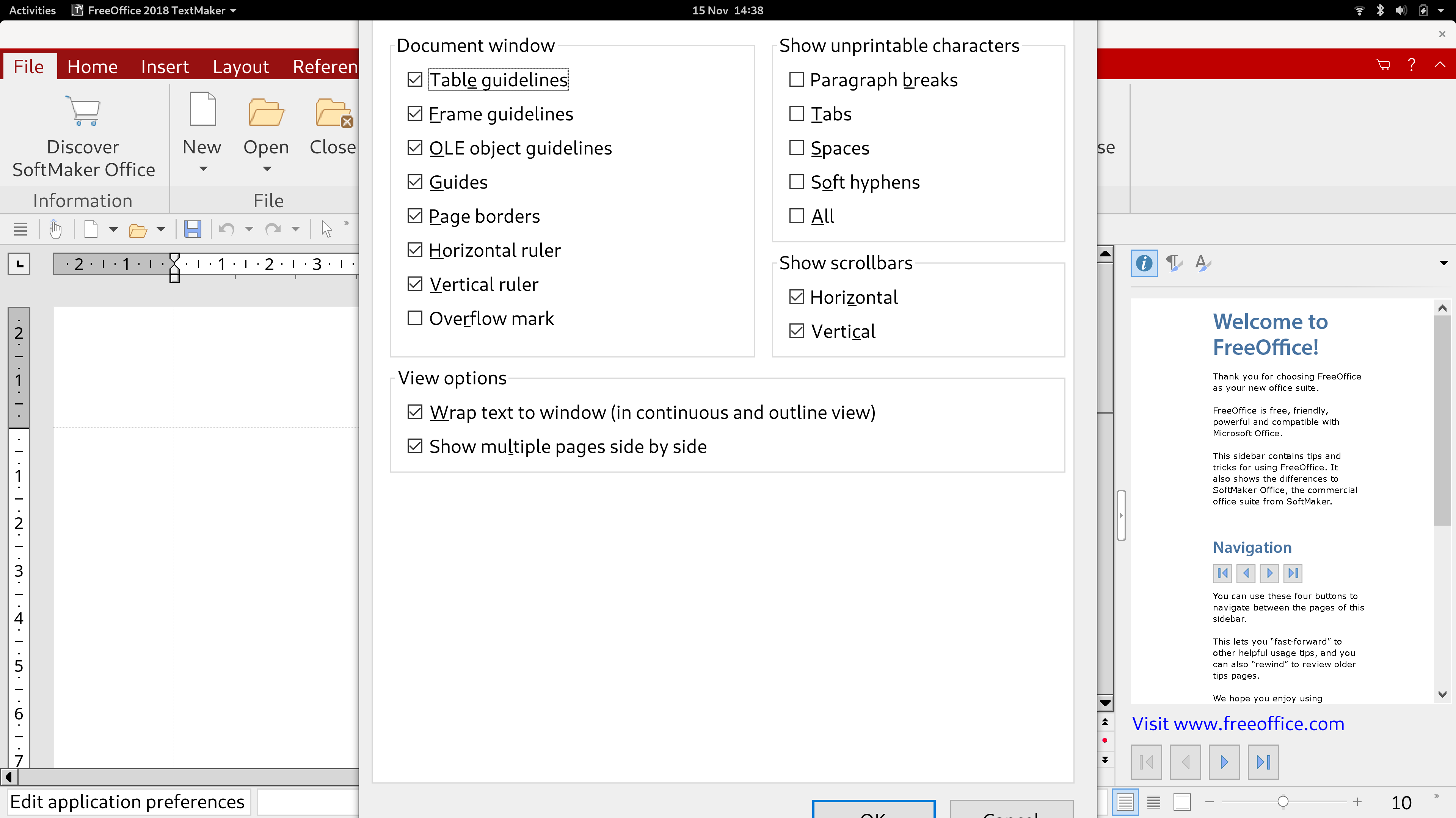 Hi I'm running FreeOffice on Fedora 30 on a Lenovo ThinkPad Yoga with a 4K screen. For whatever reason I now have really large interface text and the option to change the UI scaling is now no longer reachable from the File > Options dialog because it falls of the top of the screen (see screenshot attached).