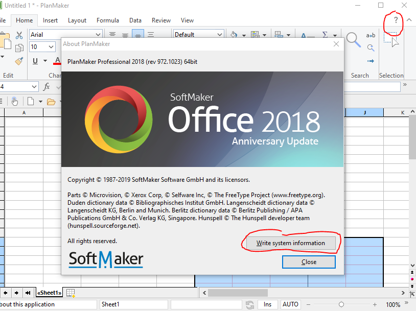 Could you please go to "? | About | Write System Information" and send us the sminfo.txt file it generates? You may post it here or send it to forum(at)softmaker.de
