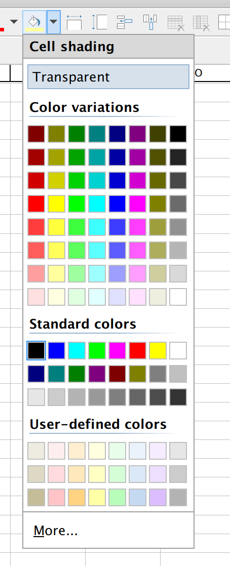 There is no button or preference to remove user-defined colors from the workbook document. See Properties: Colors: Color Palette. I can add or change a user-defined color, but once that color has been added, there is no delete button to remove it from the workbook. Worse still, If I copy a worksheet from another workbook (even one that has had the shading of all cells removed (by selecting all and selecting transparent), colors will still add themselves to the destination workbook after I copy the worksheet over.