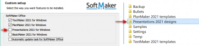 Thanks for reporting these problems. I have forwarded this problem of extra templates to our product management...beny wrote: Mon Oct 04, 2021 6:15 pm When selectively installing Office, for example, only Textmaker and Planmaker are installed, a folder with templates for Presentations is still created in C:\Users\USER\Documents\SoftMaker. If you delete it, it will be created again.