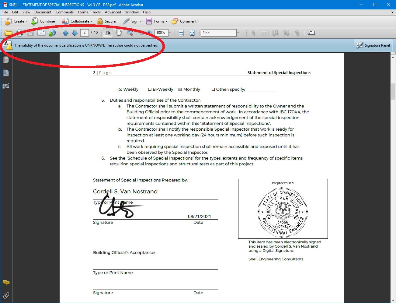 I'm attaching a screen shot of the alert Acrobat 9 offers. This document happens to have an expired certificate, and that's exactly what we need to know when opening documents that purport to have been digitally signed. If you're saying that FlexiPDF is an editor so it shouldn't check for valid digital signatures, then logic would suggest that FreePDF should perform this check ... but I don't think it does.