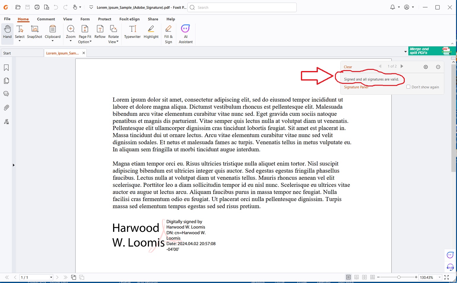 The attached image is a screen shot from the free FoxIt PDF Reader. I have highlighted where it automatically pops up a panel notifying the view that a valid digital signature has been attached. This is the functionality that's lacking on FlexiPDF and FreePDF. It's nice that FlexiPDF now has a way to verify digital signatures, but to be competitive with other products in the marketplace I respectfully suggest that it needs to be automatic. I also suggest that it should work in FreePDF as well as in FlexiPDF.