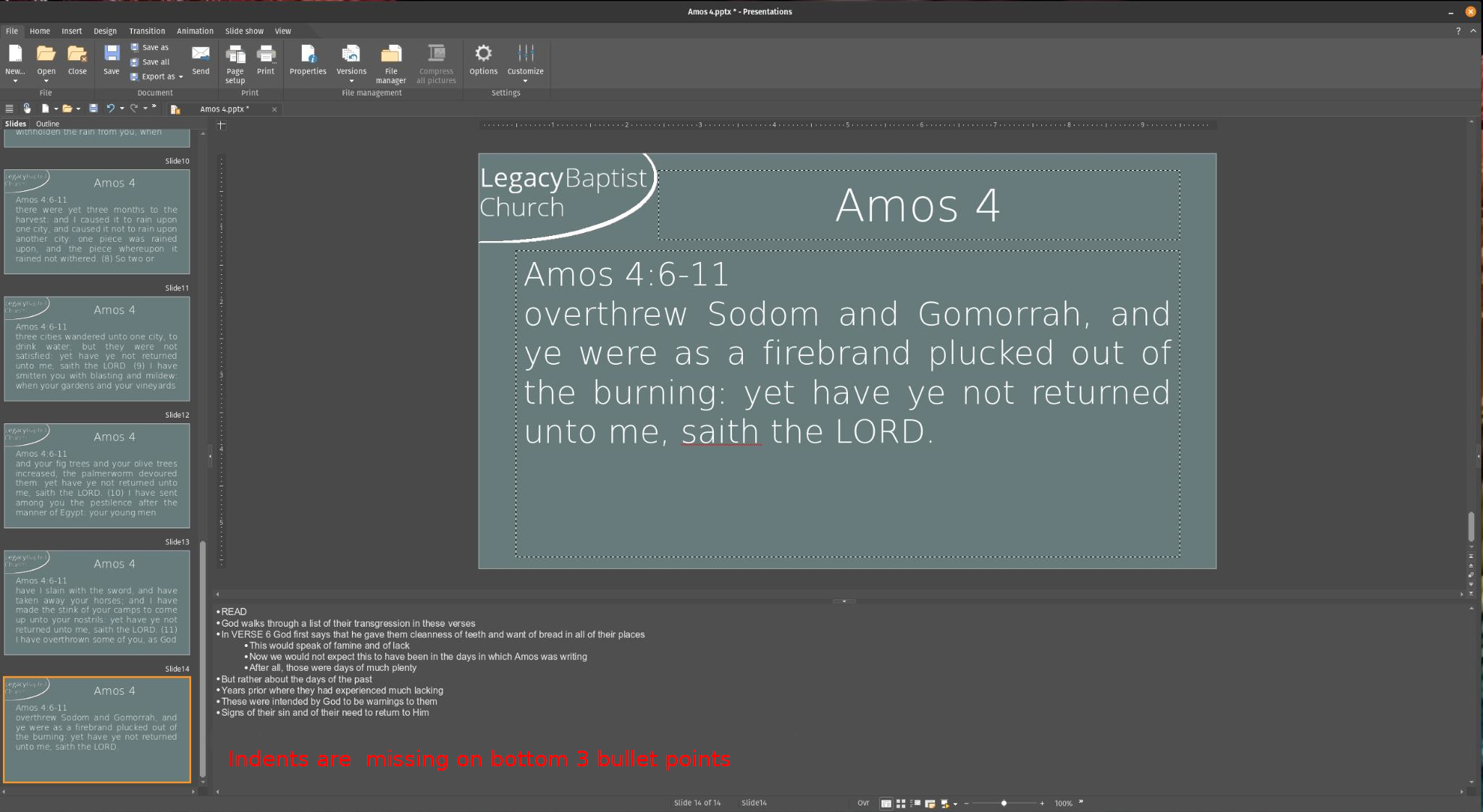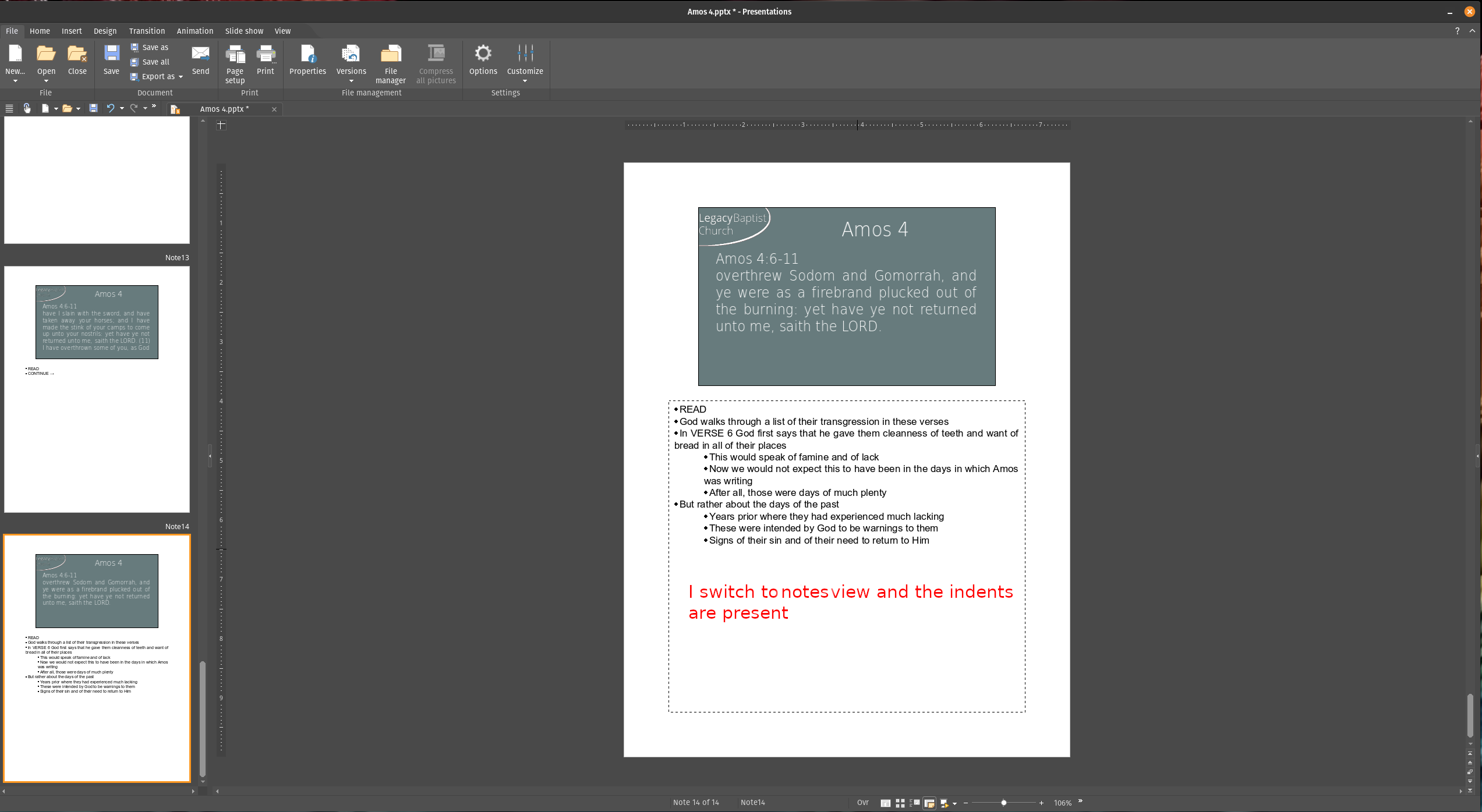 When you use bullets and hit TAB to INDENT, the indent happens but does not show up. I must switch to NOTES view to see the indents, and then when I switch back to SLIDE view the notes pane shows these formatting changes (see pictures)