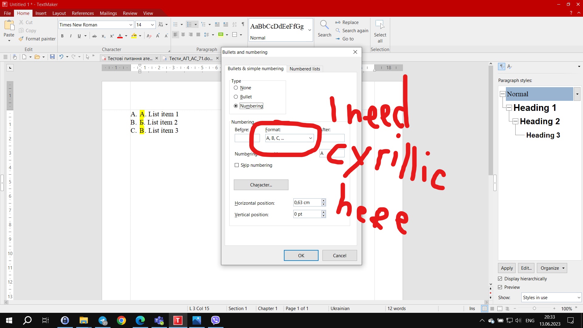 By "list" I meant numbering. Home tab -> Simple numbering -> Format numbering... -> Format <- I need cyrillic letters here.