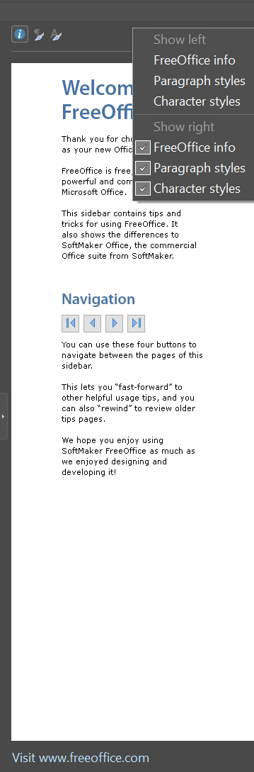How to turn off the "welcome to freeoffice" tab in the sidebar?
